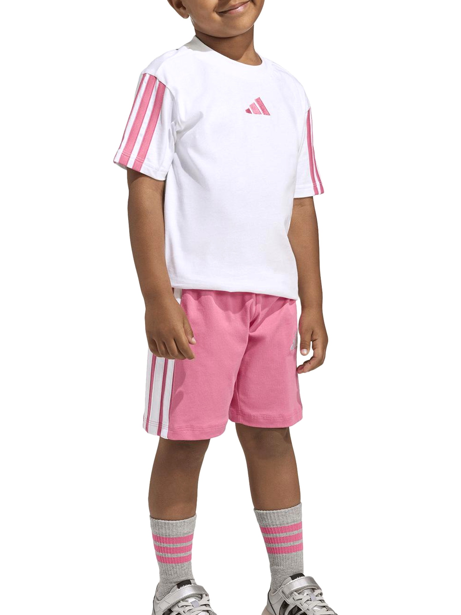Il completino bambino Adidas Essentials 3-Stripes è la scelta ideale per garantire comfort, stile e libertà di movimento ai più piccoli. Realizzato con materiali di alta qualità, questo set comprende una maglietta a maniche corte e pantaloni abbinati, entrambi caratterizzati dalle iconiche tre strisce laterali che contraddistinguono il marchio Adidas.