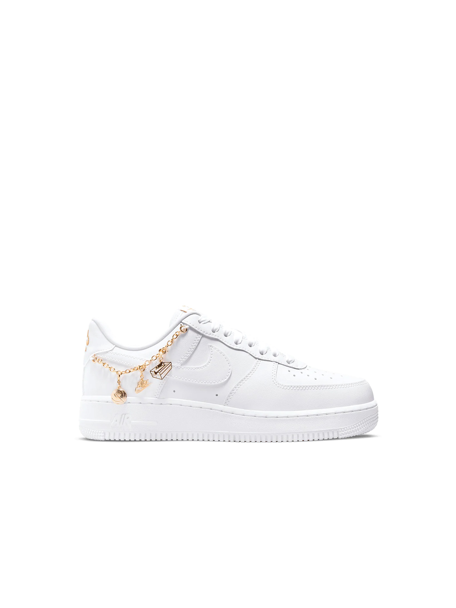 Questa versione mantiene la classica silhouette low-top delle Air Force 1, caratterizzata da tomaia in pelle premium bianca liscia che garantisce resistenza, comfort e facilità di abbinamento con qualsiasi outfit urbano o casual. Il vero elemento distintivo è rappresentato dai dettagli Lucky Charms, piccoli charm metallici applicati sui lacci che richiamano lidentità del brand e aggiungono un tocco brillante e femminile, trasformando la sneaker in un accessorio di stile oltre che in una calzatura sportiva. Lintersuola con tecnologia Air assicura ammortizzazione leggera e supporto durante lutilizzo quotidiano, mentre la suola in gomma con pattern circolare offre trazione e durata nel tempo.